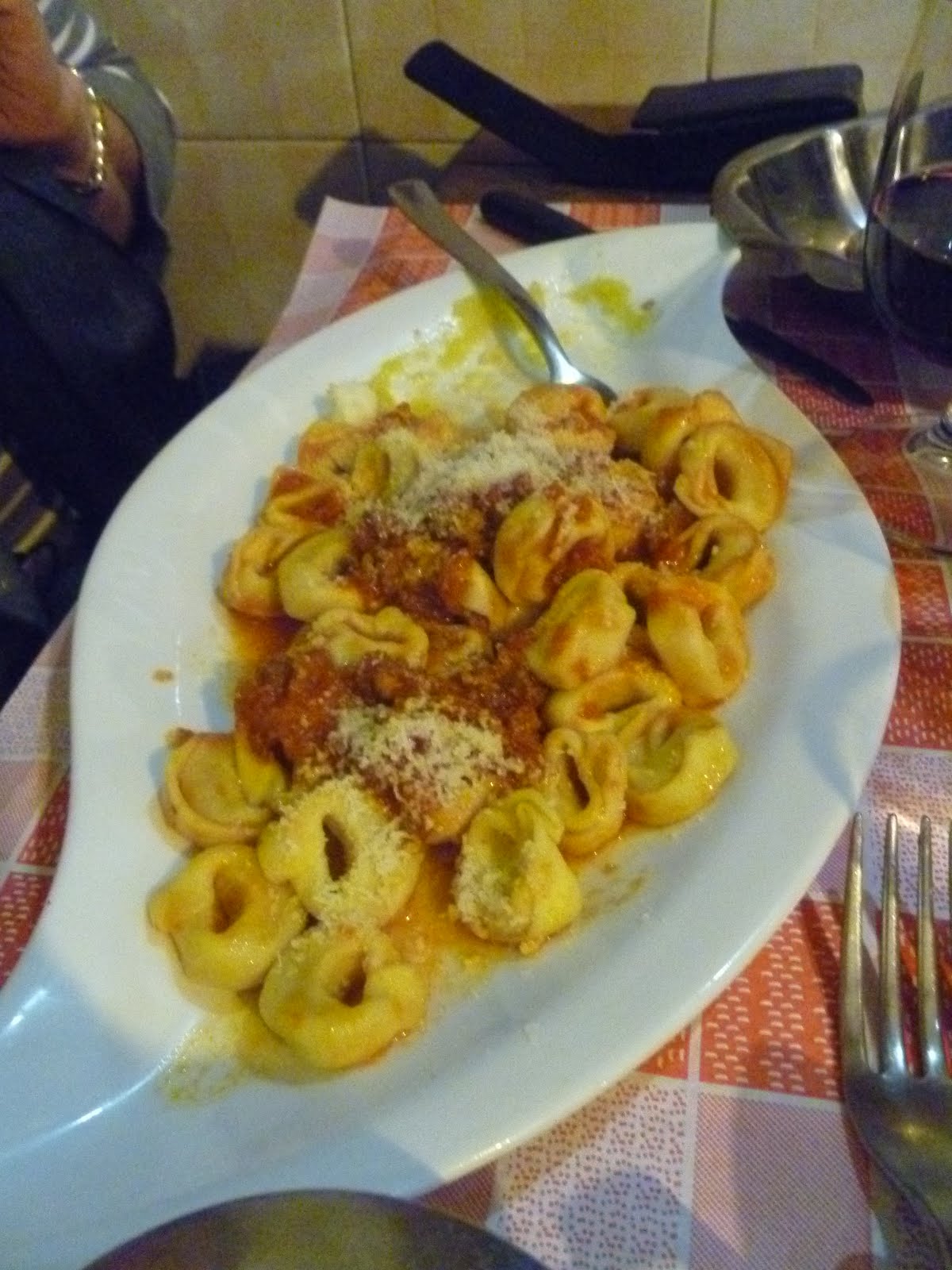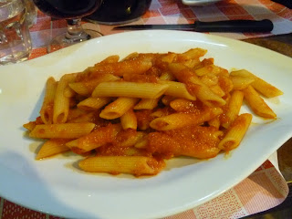 Our second dinner experience was much different, but fun and exciting. We signed up for a 3 course "meal deal" including wine, water, primi, secondi, and side for a flat fee. This small trattoria style restaurant was perfect to capture the small town feel and I felt like I was eating in a true Italian kitchen. The restaurant also permitted street musicians to enter the restaurant so we got to listen to some nice accordion music while enjoying our meal. Between the three of us eating, we were able to capture a good sampling of traditional Italain dishes. Tortollini, Penne arrabiata, and spaghetti bolonese as well as Tuscan sausage, chicken, and pork chop. We left this adorable little place fatter and happier and ready to rave about the food of Florence right along side the art and the shopping.