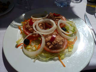 For my first meal in Spain, lunch in fact, we went to a small cafe on the water. Since it was warm weather I went for a tuna fish salad, something nice and cool. It was not as I was expecting...like a tuna fish salad would be at home, but it was even better. As shown below, the tuna, so fresh I could barely stand it, was served on tomatoes and a bed of lettuce and onions. Even though the heat can sometimes take away my appetite I ate every last bite.