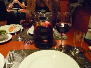 The first thing to understand about Spaniards is that they eat their dinner very late, even by Italian standards. We got to the restaurant around 9:30 and had to wait and were not seated until 10:15....because the restaurant was so crowded. Even then, people were still sitting down to start their meals as late as 11:30. To read more about Spanish eating habits, take a look at this great article from Spanish Lifestyle Magazine. Anyways, once we were seated, we were quick to order pan con tomate....a starter of bread with tomatoes, and a pitcher of sangria to share.