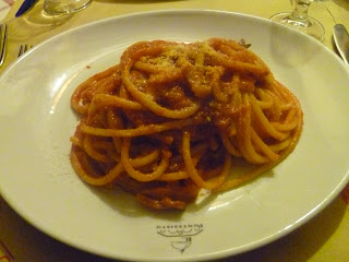 Bucatini all'amatrciana. It's a mouthful to order, yes, but if you like carbonara you'll LOVE this dish. Along the same lines, the sauce is made out of tomatoes, panchetta, and cheese. Where can you go wrong? I'm also convinced that panchetta just makes anything taste so wonderful that I will probably want to add it to just about any dish when I got home.